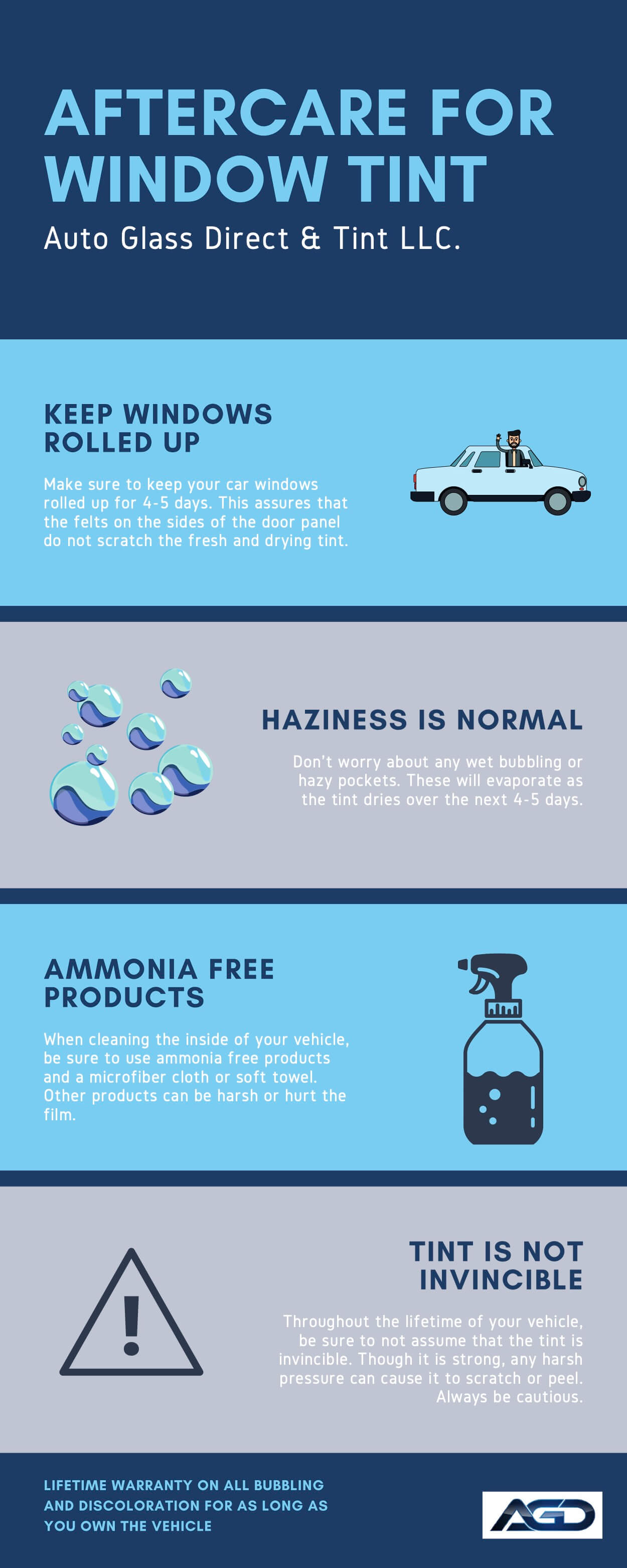 When cleaning the inside of your vehicle, be sure to use ammonia free products and a microfiber cloth or soft towel. Other products can be harsh or hurt the film.